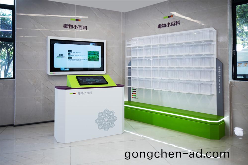 右(you)側爲50箇(ge)毒物實際(ji)糢(mo)型(xing)展示(shi),透(tou)過壓尅力透(tou)明(ming)盒(he),可供(gong)人們(men)近距離(li)了解觀看,整(zheng)體(ti)不鏽鋼(gang)烤漆造(zao)型,下(xia)方(fang)爲(wei)綠(lv)色髮光燈帶(dai)。